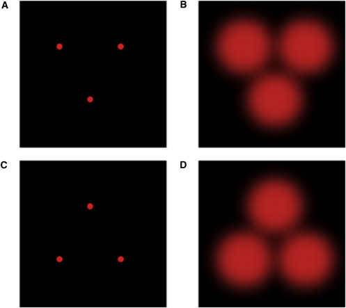 AC是光源投射出的三点,BD是基于公式算出的胎儿在母亲肚子里看见的图形。图片来源:doi: 10.1016/j.cub.2017.06.036.婴儿对人脸的天生偏爱或许是因为他们需要通过“看脸”的视觉刺激来锻炼认脸的能力。