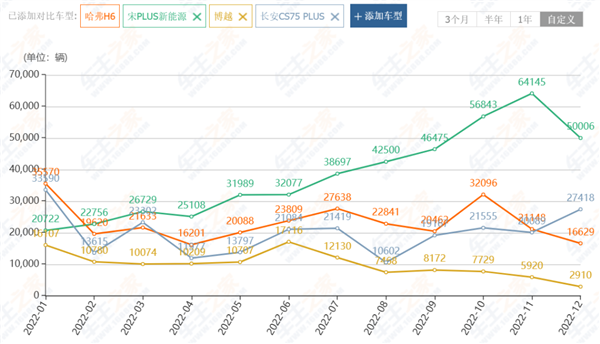 一个是哈弗 H6,在宋 PLUS 打击下,它直接从王者跌成亡者,一路下跌再无翻盘,到如今还不足 5000 ;