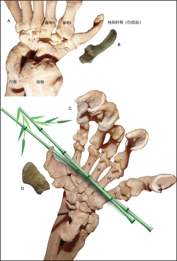 大熊猫(A, C)和始熊猫(B, D)伪拇指的解剖结构 (图片来源:中国科学院古脊椎动物与古人类研究所)02