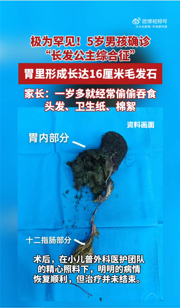 极为罕见!5岁男孩确诊“长发公主综合征” 胃里取出长达16厘米毛发石