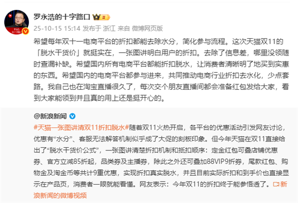 罗永浩点赞天猫双11折扣“脱水干货价”:挺实在 去除了信息差 网友热评:价格裸奔才是真的省