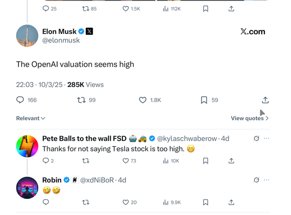 马斯克只能略有些酸溜溜地在X上评论说,OpenAI的估值过高了。