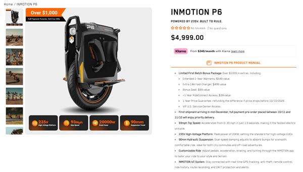 极速狂飙150km/h!最强悍的独轮平衡车InMotion P6发布