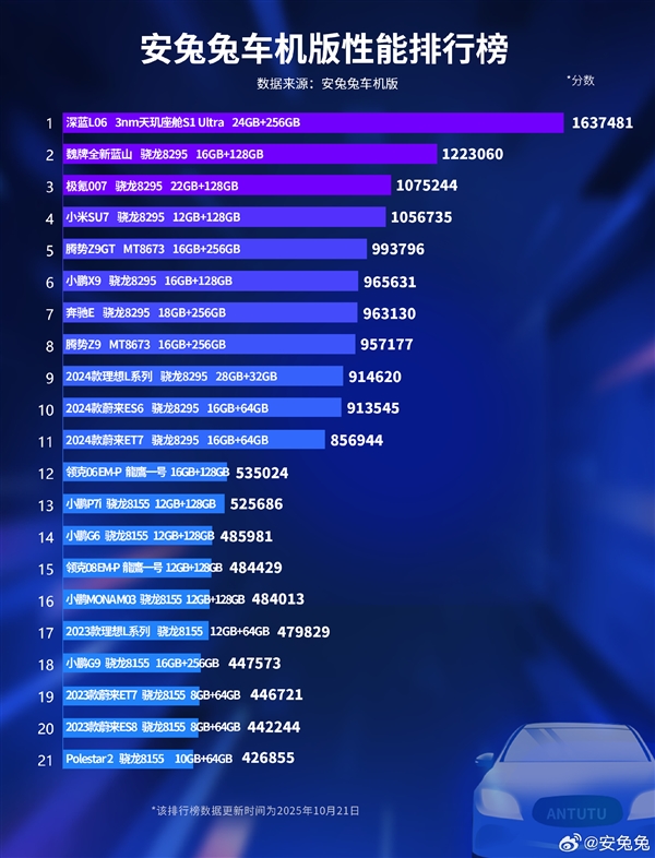 安兔兔车机跑分1637481!深蓝L06天玑3nm座舱芯片断层领先
