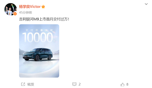 10月22日消息,吉利银河官方宣布,吉利银河M9上市1个月,交付总量突破万台。