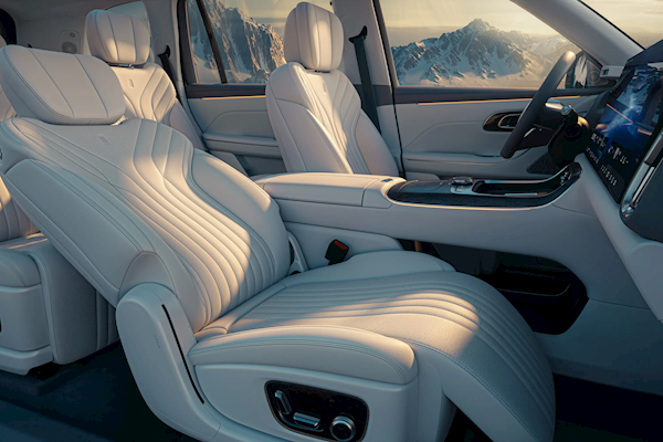 采用2+2+2的六座布局,座椅采用打孔真皮材质,中央通道后方设有一个大尺寸的扶手箱,第二排为两个独立航空座椅,过道宽度有180mm,配备无缝腿托、腰托,具备通风、加热、10点按摩。