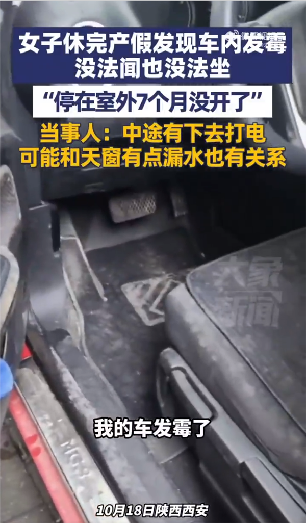 女子修完产假发现车发霉 当事人:7个月没开 中途有下去打电 可能跟天窗漏水有关