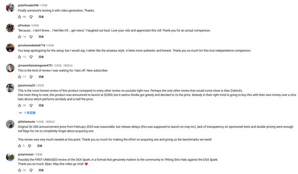 幸好油管博主Bijan Bowen做了一次深入对比,我们就借用他的数据来看看,从网友评论看该博主的测试被称赞称为真正独立客观,最为诚实,而其他类似测试都像是DGX Spark的广告。