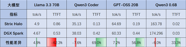 但是TTFT,也就是输出第一个token的时间,AMD Strix Halo取得了三胜一负的好成绩,而且领先幅度都非常大, NVIDIA DGX Spark只是在Llama上赢了一次。