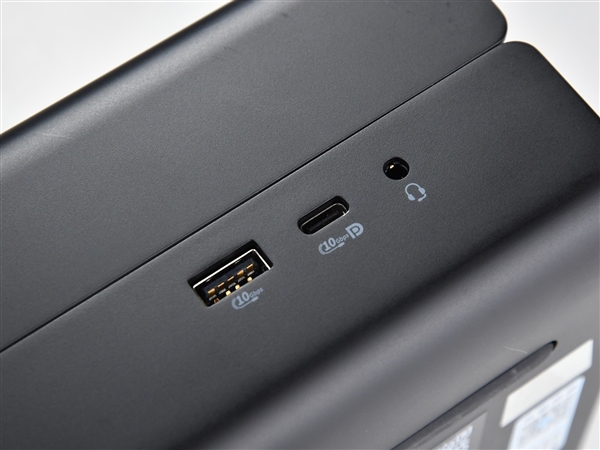 对于迷你主机来说,优异的扩展性必不可少,惠普Z2 Mini G1a也不例外。这款机器在机身左侧设计有1个10Gbps传输速度的USB Type-A可充电接口,在其右侧配有1个10Gbps传输速度的USB Type-C接口,并且支持USB对外供电和DP 2.1视频传输,再靠右侧是1个3.5mm耳麦插孔。
