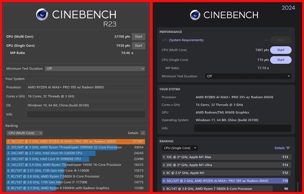其实此前我们测试过锐龙AI Max+ 395处理器的性能,而锐龙AI Max+ PRO 395与前者规格相同,只是增加了AMD PRO企业级安全管理技术,所以就看机器模具的散热设计是否能进一步帮助性能得到释放。首先从CINEBENCH R23和2024测试来看,惠普Z2 Mini G1a确实做到了:在R23测试标准下,单核得分1938,多核得分37708;2024标准下单核得分110,多核得分1881。多核性能都比此前我们测试的成绩要高出不少。