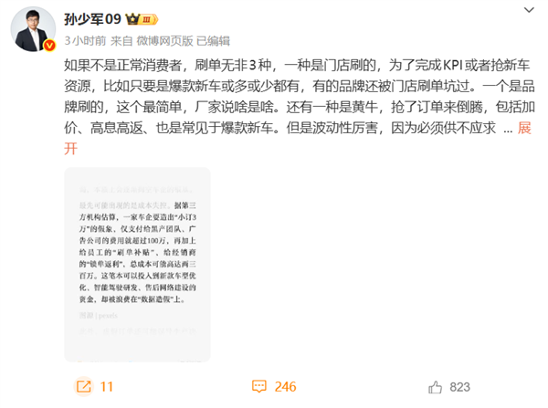 媒体称车企“小订3万”造假 成本要300万!博主详解造假方式