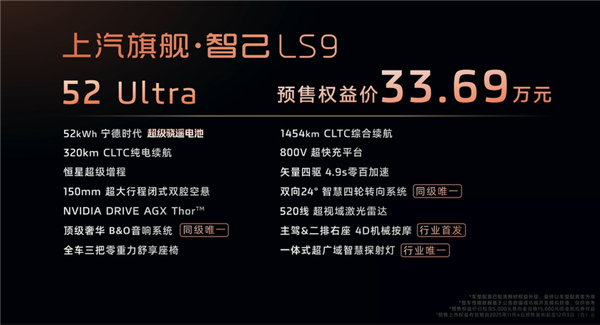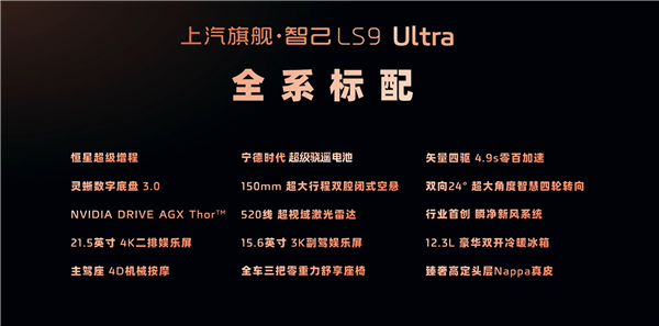 让人期待的是,LS9还拥有Hyper版,将具备线控转向、高性能三电机矢量四驱系统,零百加速提升至3秒级,预计明年初上市。