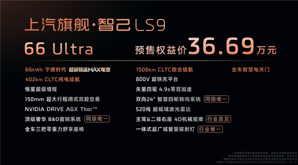 11月4日消息,刚刚,上汽智己LS9预售,共推出两款车型,权益价33.69-36.69万元,同时官方还公布了预售权益,详情可戳图了解。