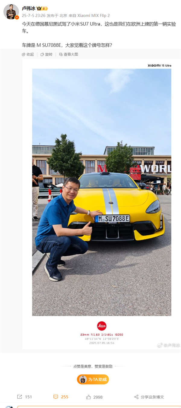 卢伟冰第一次在德国高速开小米SU7 Ultra 白色车牌简约大气